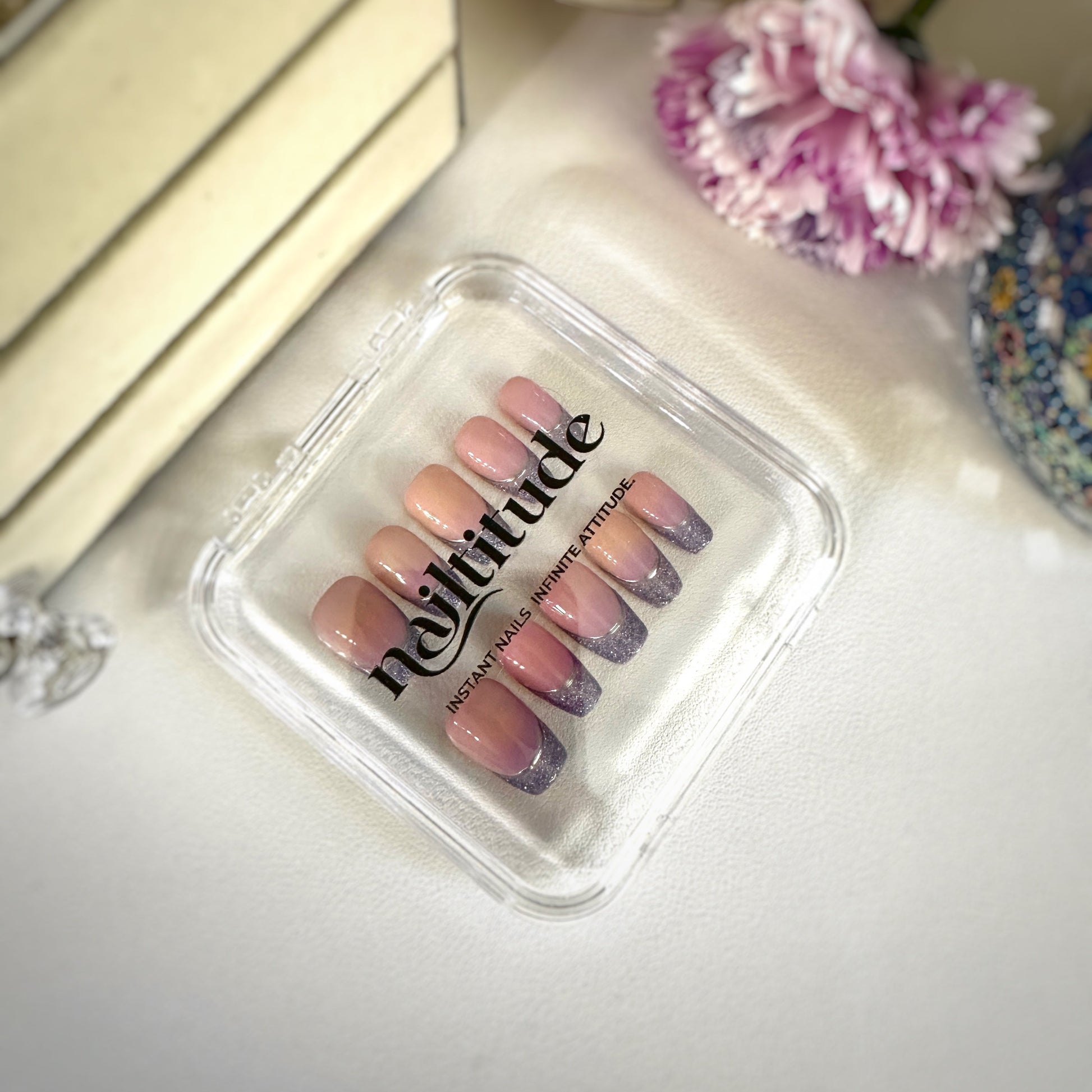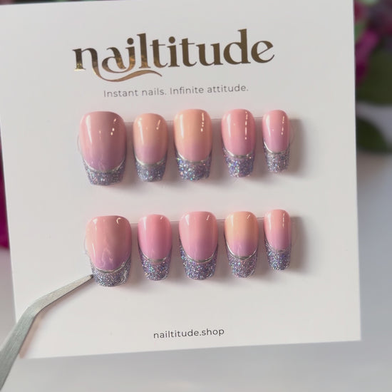 The "Lavendelle" set captures the perfect balance between delicate elegance and subtle glamour. Featuring a flawless nude base that flatters every skin tone, each nail transitions into a dreamy lilac gradient that melts seamlessly into a sparkling lavender glitter French tip.